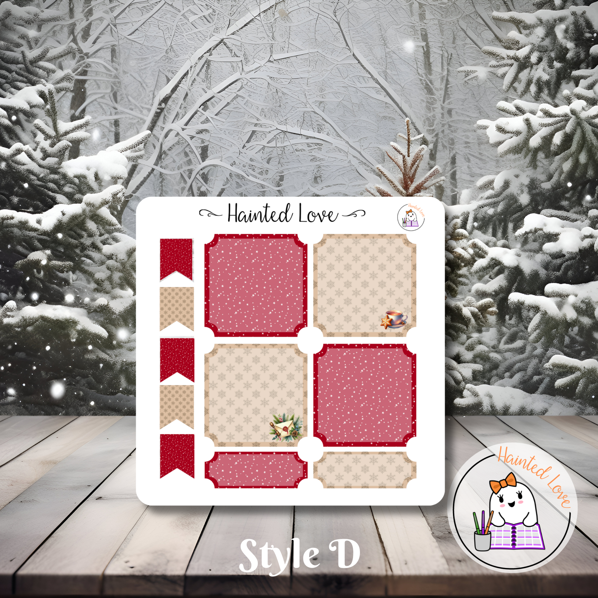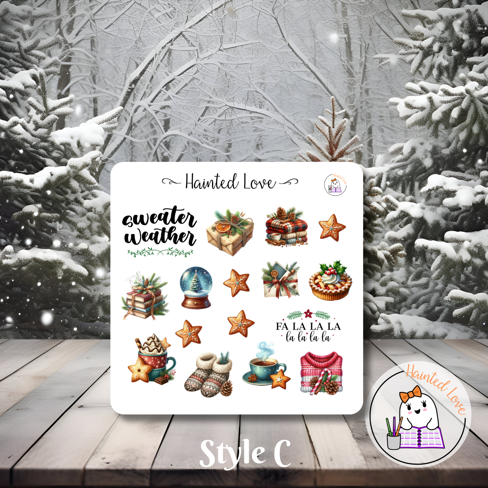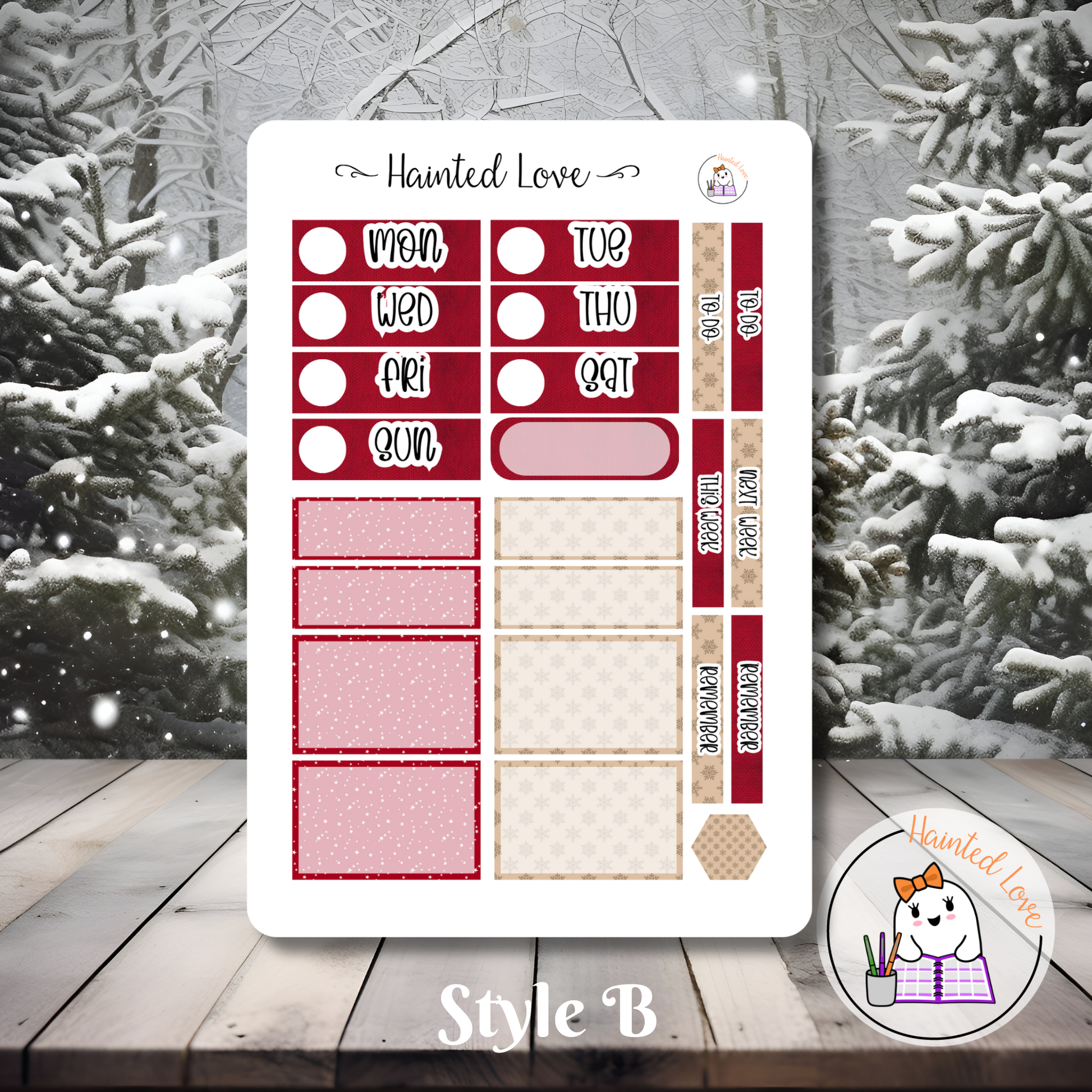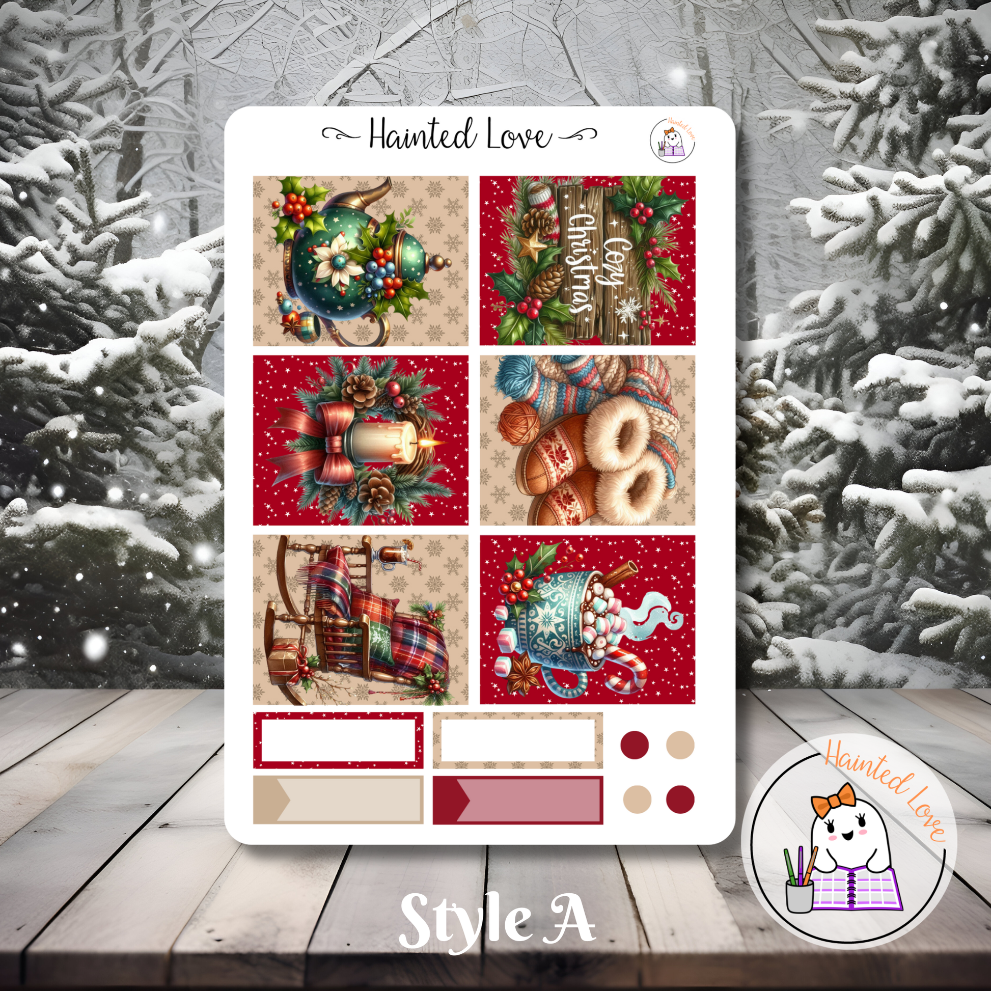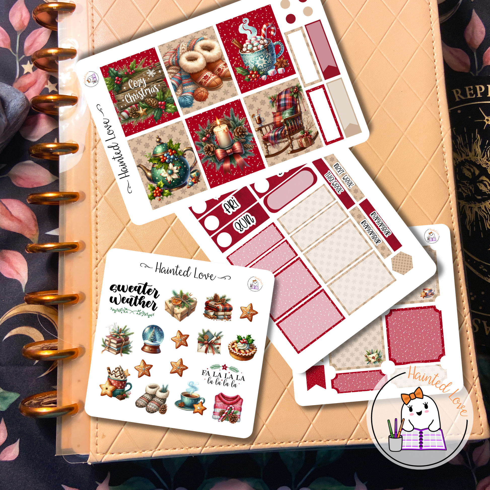 A cozy Christmas planner sticker kit featuring soft reds, warm tones, and festive illustrations to bring seasonal comfort to your spreads. Perfect for holiday planning, memory keeping, and creating a warm winter vibe.